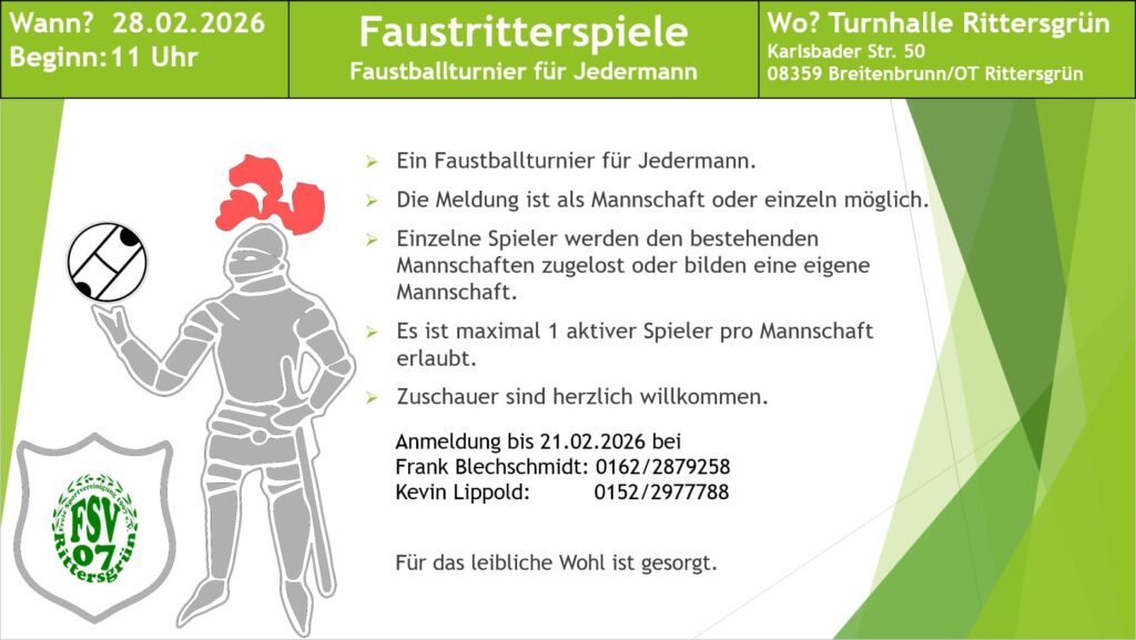 Der Faustball in Rittersgrün wird in diesem Jahr 75 Jahre alt und mit unseren Faustritterspielen hat sich einen großartige und junge Tradition in Rittersgrün etabliert.